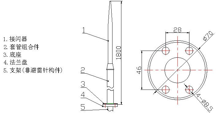 當DXH06‐P/1.8B 型避雷針受雷擊時,由接閃器接閃,并將雷電流疏導入地。其結(jié)構(gòu)能抑制由于接閃器接閃引起的對被保護物的側(cè)擊。
