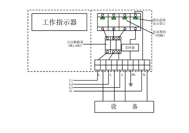 當(dāng)某相脈沖過電壓太大,通流容量超過額定值,使防雷模塊被擊穿,或頻繁過電壓引起防雷模塊擊穿時(shí),對(duì)應(yīng)相自動(dòng)斷路器(ZK)會(huì)因過流而自動(dòng)斷開防雷模塊回路,以保護(hù)電源電路工作不受影響,防止火災(zāi)。此時(shí)對(duì)應(yīng)相指示燈會(huì)熄滅,指示對(duì)應(yīng)相有故障。當(dāng)零線處于斷路狀態(tài),所有指示燈熄滅。