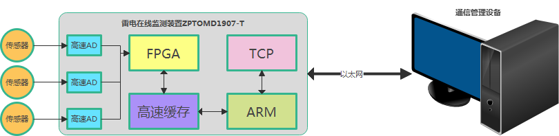 雷電在線監(jiān)測裝置通過雷電流傳感器采集雷電脈沖,經(jīng)過流/過壓保護后,將輸出的是幾十至幾百伏的雷電壓脈沖信號分壓、分流后送入高速A/D進行數(shù)字化處理。FPGA將實時對數(shù)字信號進行緩存并與ARM交互數(shù)據(jù),ARM將雷電流緩存數(shù)據(jù)進行數(shù)字濾波計算,并將處理后的雷電流數(shù)據(jù)保存在內(nèi)部寄存器中,同時ARM實時響應(yīng)來自modbus master的modbus TCP消息,返回對應(yīng)的雷擊數(shù)據(jù)。